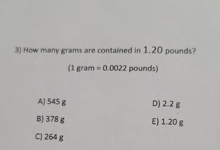 A 545 g B 378 g C 120 g D 264 g E 22 g. How many grams are contained in 120 pounds. How many grains is this.